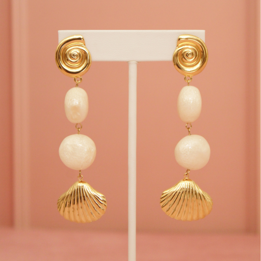 Aretes en acero inoxidable con detalles de mar y bolitas de acrílico nude.